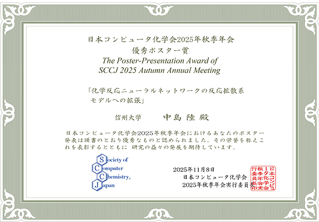 日本コンピュータ化学会2025年秋季年会@岐阜市文化センターに参加してポスター発表を行い、中島陸君(M1)が優秀ポスター賞を受賞しました。おめでとうございます。(詳しくはこちらhttps://www.sccj.net/aboutus/award/)