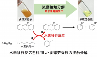 我々は、FCCプロセスでの多環芳香族の分解を目指し、接触分解反応場で進行する水素移行反応に着目しました。水素移行反応は2分子間での水素の授受反応ですが、生成するガソリンのオクタン価を低下させる反応として従来の触媒設計では抑制されてきました。しかし、これまでの検討で、水素移行反応を促進することでFCCプロセス内でも多環芳香族の分解が可能であることが確かめられました。現在は、反応機構の詳細な解析や更なる分解促進に向けた触媒設計に取り組んでいます。また、水素移行反応活性が高い反応場でも生成ガソリンのオクタン価を低下させないための反応設計にも取り組んでいます。