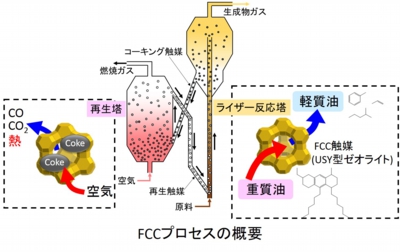 重質油の需要が減少する一方で、化学品原料となる軽質炭化水素の需要は増大しています。そこで、重質油を分解して軽質油に転換する流動接触分解(Fluid Catalytic Cracking:FCC)プロセスの重要性が増しています。FCCプロセスは、ゼオライト触媒を用いて重質油を分解するプロセスであり、外部からのエネルギーや水素の導入が不要であるために、安価で効率的なプロセスとして知られています。しかし、重質油中に多く含まれる多環芳香族は安定性が高く、FCCプロセスでの分解は困難とされてきました。