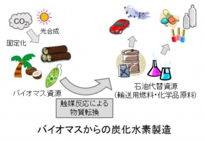 さらに、植物油の接触分解反応の知見を応用し、豊富な資源量を誇る木質バイオマスを原料に用いた炭化水素燃料合成にも取り組んでいます。