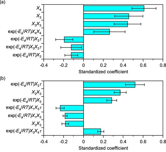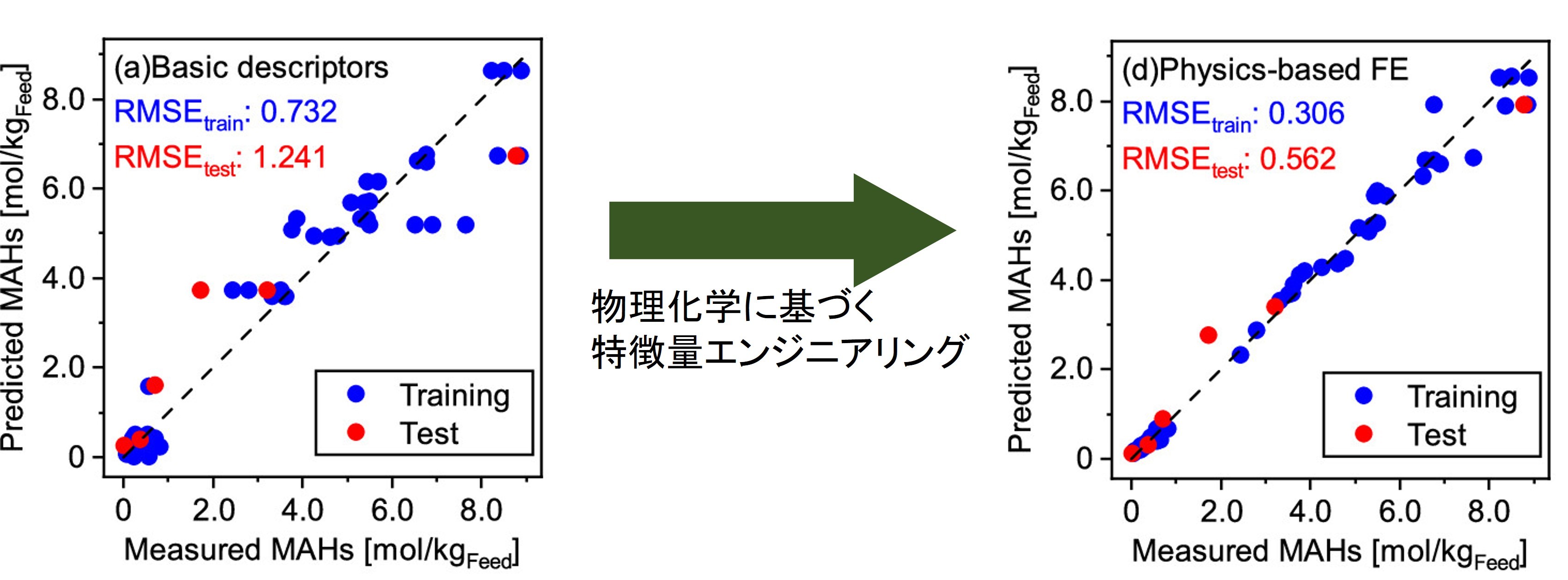 一般に、機械学習には予測精度と解釈可能性の間にトレードオフがあることが知られています。高い精度で予測ができる非線形モデルはブラックボックスになりがちで、そこからは重要な反応因子の抽出が困難です。この問題に対し、我々は機械学習と物理化学の融合によって解決を図ります。具体的には、解釈可能性の高い線形回帰モデルに対し、物理化学に基づく特徴量エンジニアリングを組み合わせることで高い予測精度が得られることを明らかにしました。さらに、線形回帰の標準回帰係数から重要な反応因子が抽出できる可能性を確かめました。